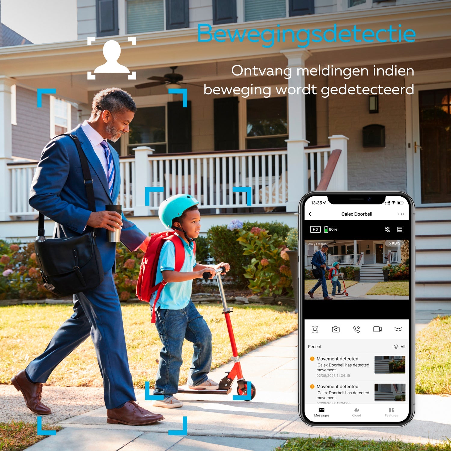 Via de Calex Smart App houd je je deurbel overal ter wereld in de gaten. Beheer al je Calex-apparaten, inclusief deze deurbel, centraal in één app. Je ontvangt meldingen wanneer er wordt aangebeld én bij bewegingsdetectie. Pas eenvoudig het detectiegebied aan om onnodige meldingen te voorkomen.