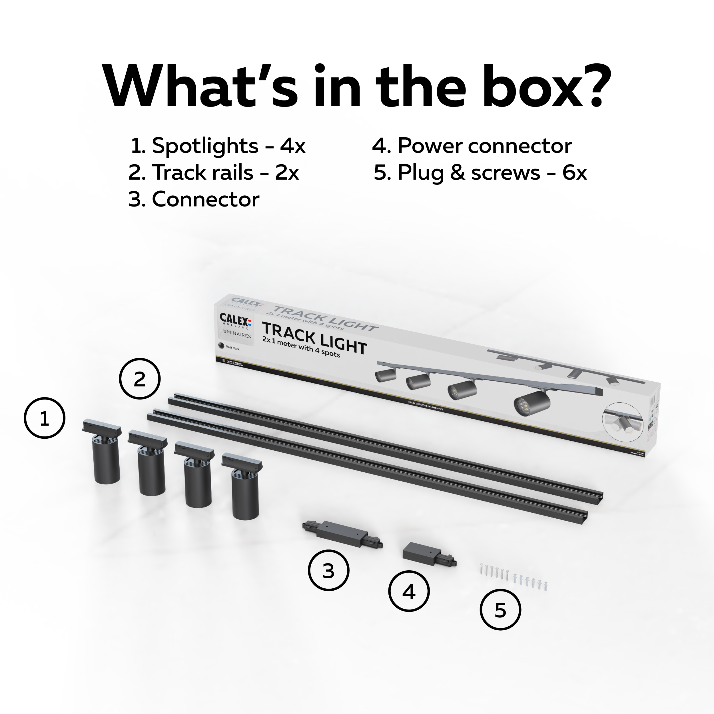 De Calex Tracklight 2 Meter met 4 Spots is dé keuze voor wie op zoek is naar een stijlvol en veelzijdig verlichtingssysteem. Dankzij de elegante zwarte afwerking en het minimalistische design past dit tracklight perfect in een moderne woonkamer. Met de 2 meter lange rail en vier vaste spots creëer je eenvoudig de juiste sfeer. Richt de verlichting bijvoorbeeld op de eettafel voor gezellige diners, op de zithoek voor extra comfort of gebruik het licht om kunstwerken en decoraties subtiel te benadrukken. Zo geniet je altijd van een woonkamer die zowel sfeervol als functioneel is verlicht.Flexibiliteit en Lichtkwaliteit