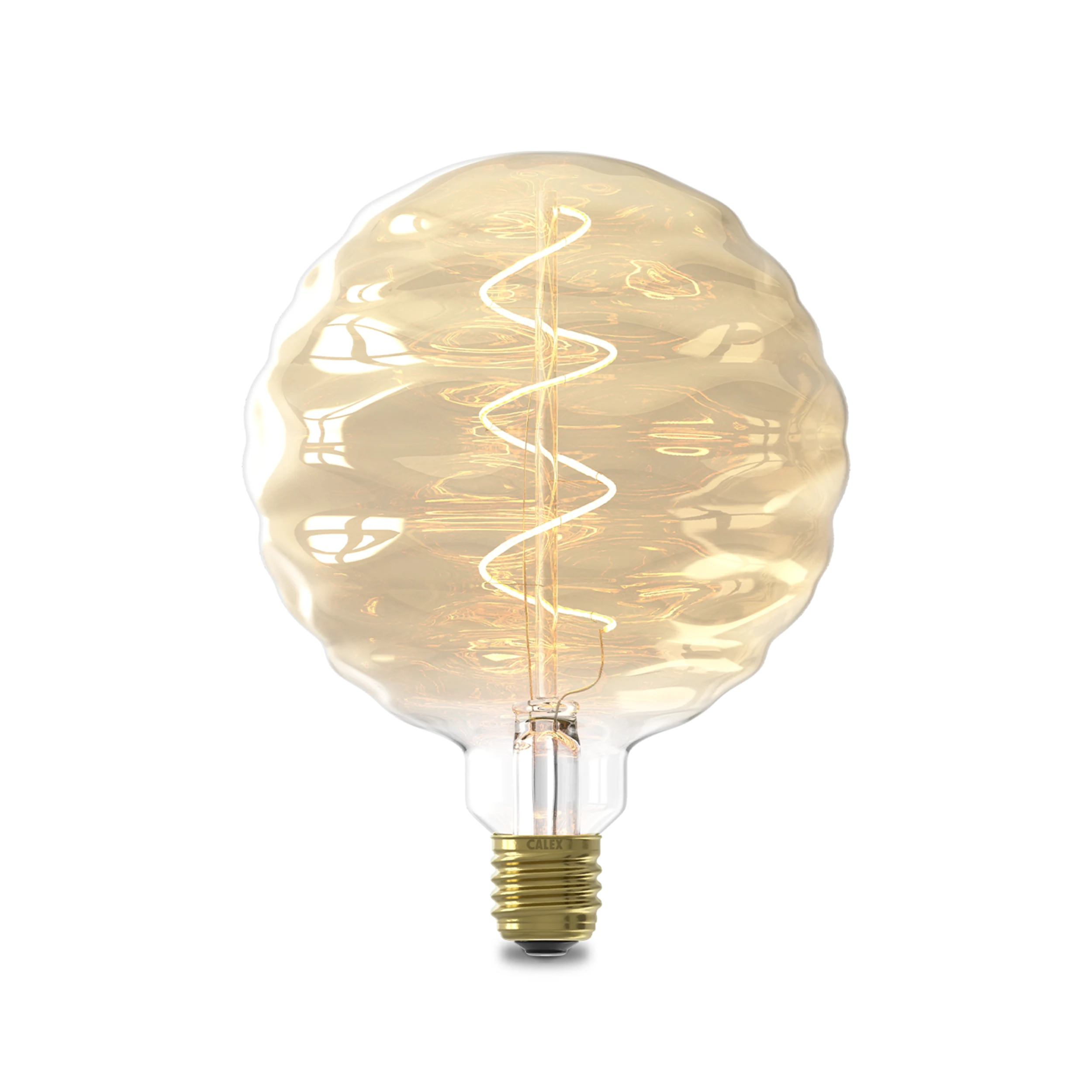 De Calex Bilbao Goud lamp valt op door zijn glas met golvend water-effect en warme gouden afwerking. Met een decoratief enkel spiraalfilament combineert deze lamp artistiek design met de efficiëntie van moderne LED-technologie, waardoor hij perfect is als blikvanger in hanglampen en open armaturen.