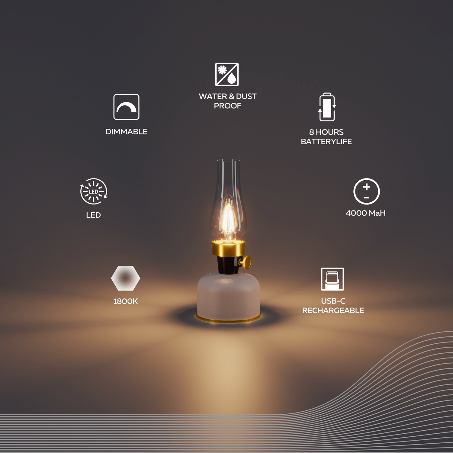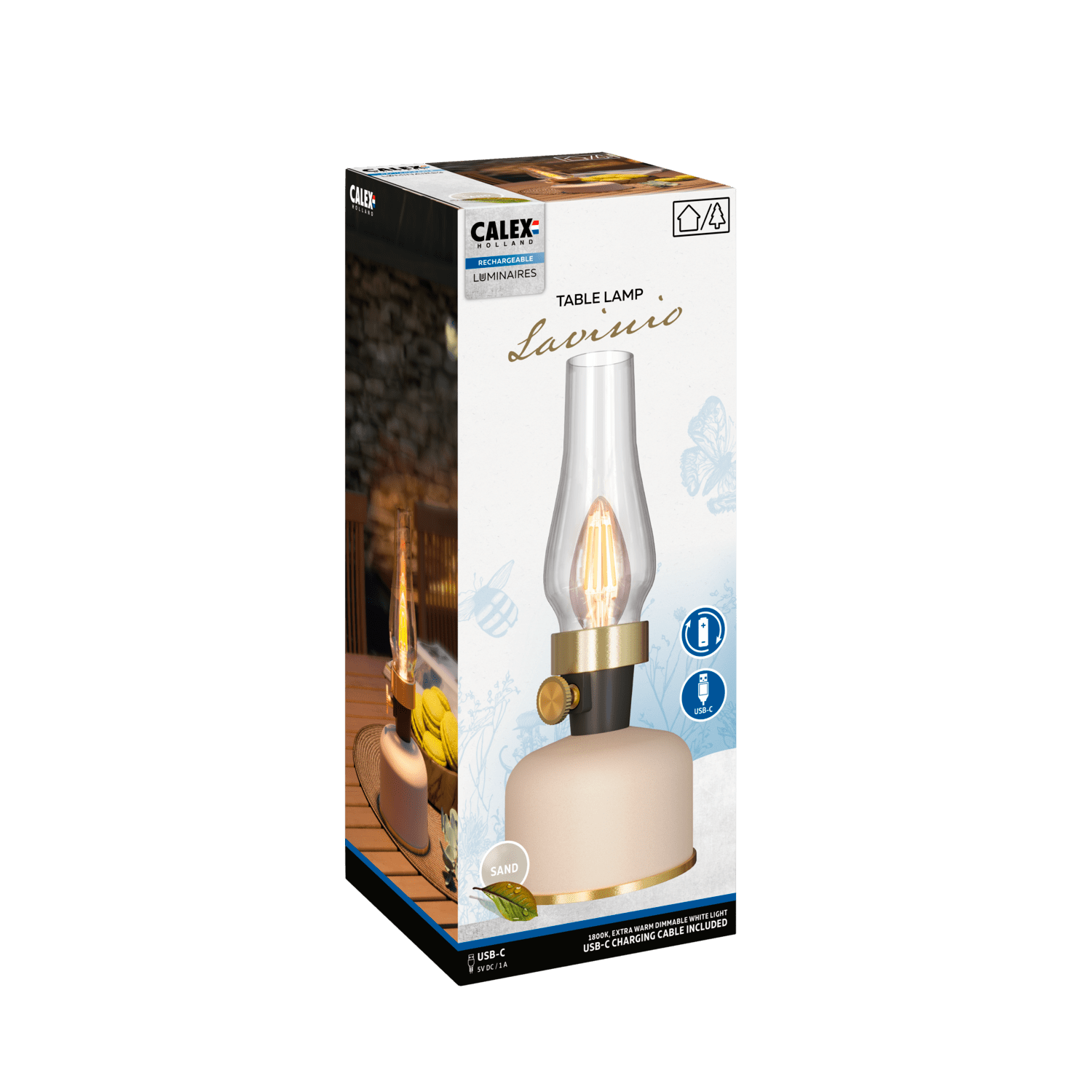 De Calex Lavinio tafellamp combineert een tijdloos olielampontwerp met moderne LED-technologie. Dankzij het extra warme dimbare witte licht (1800K) creëert deze lamp een gezellige en sfeervolle ambiance – perfect voor thuis, op het balkon, in de tuin of tijdens het kamperen.