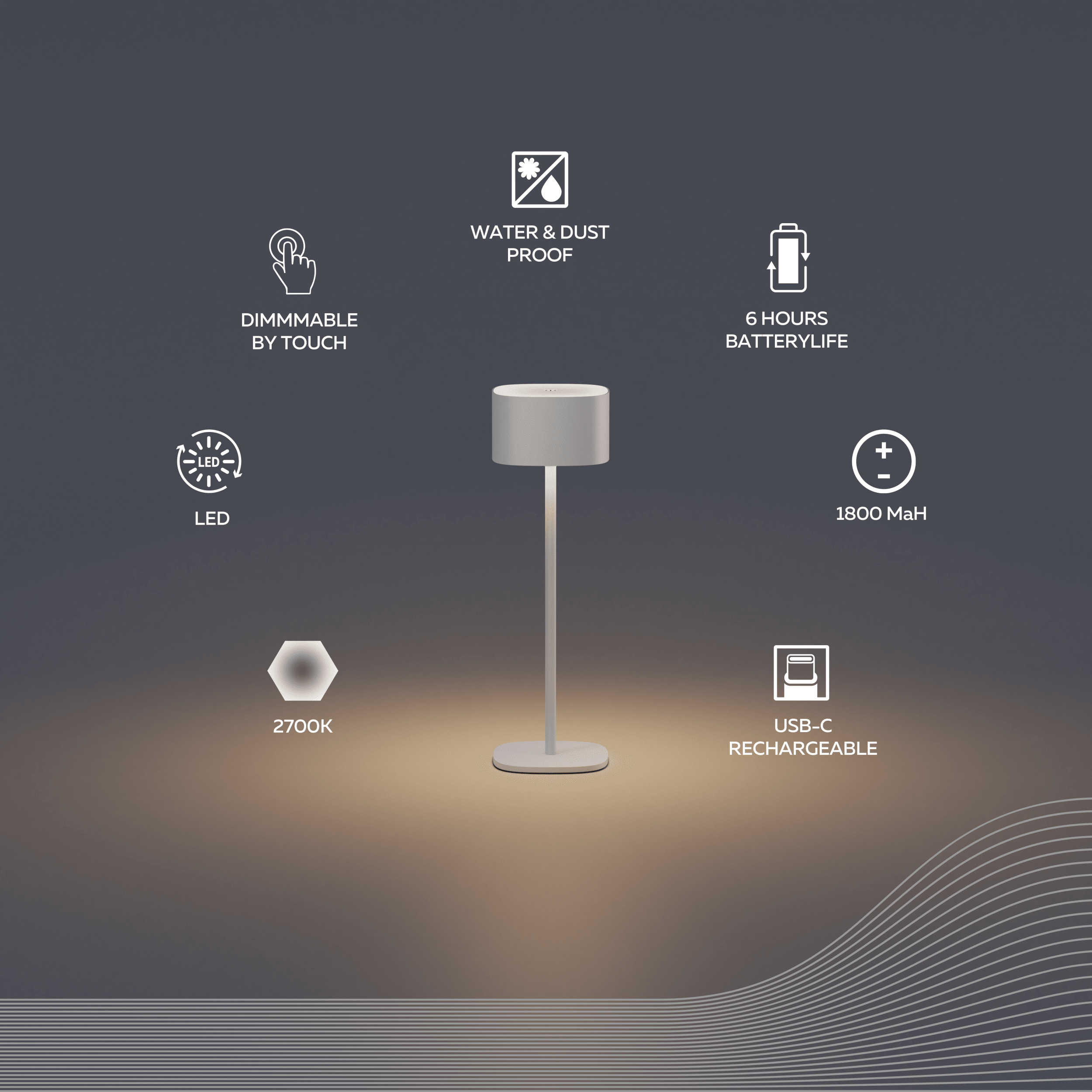 No more hassle with cables! The Serino lamp is completely wireless and features a powerful 1800mAh rechargeable battery. It charges easily with the included USB-C cable in just 3.5 hours. A full charge provides up to 6 hours of illumination, making it ideal for flexible use both indoors and outdoors.Easy Touch Control